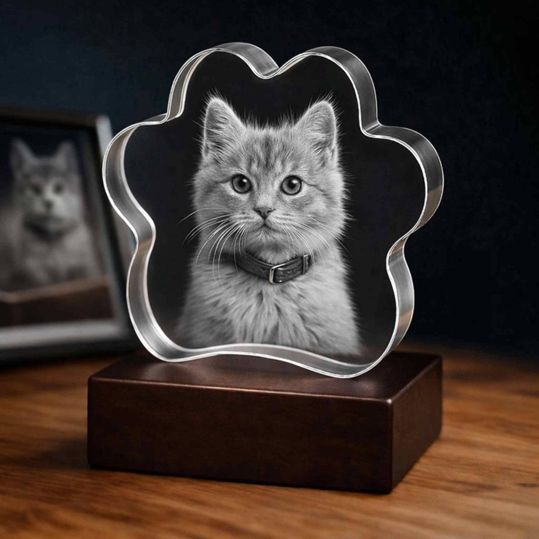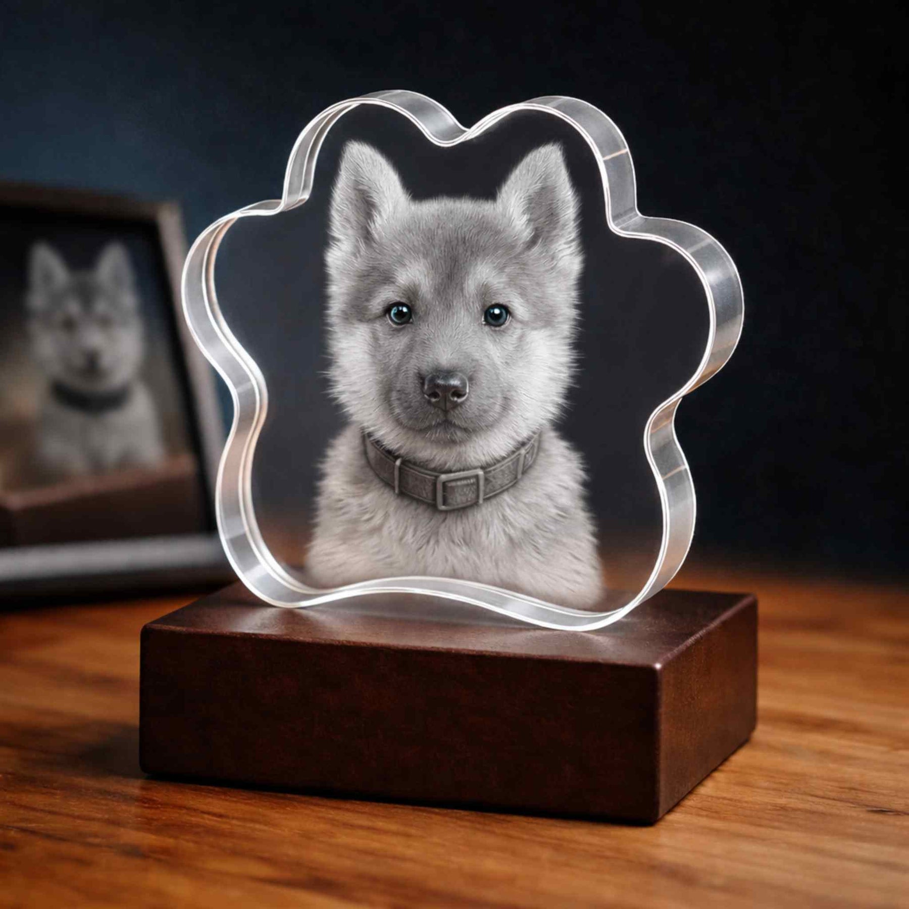 Shaped like a paw to symbolize the unbreakable bond you share, this elegant keepsake transforms your favorite pet photo into a stunning 3D laser-engraved portrait—captured with exceptional depth, detail, and clarity.